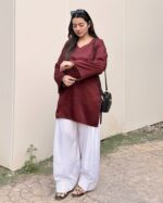First of all the colour combination is so elegant 😍 the material is soft and so good for sensitive skin and sleeve work is nice and the farshi shalwar is good